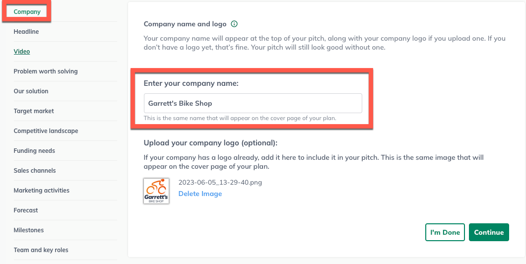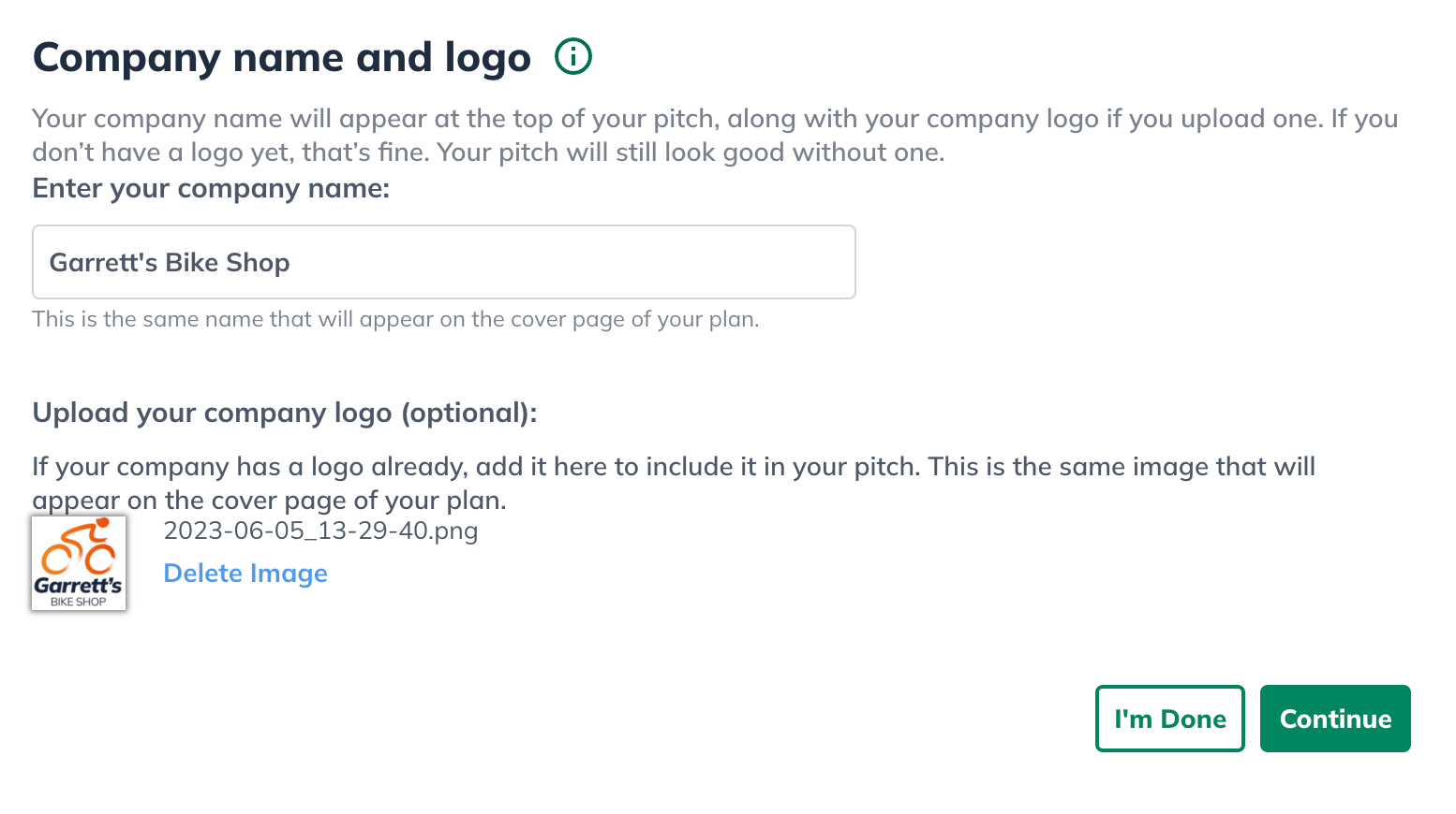 Note: Changing the company name here will change it in the Pitch, but not the Plan or cover page.