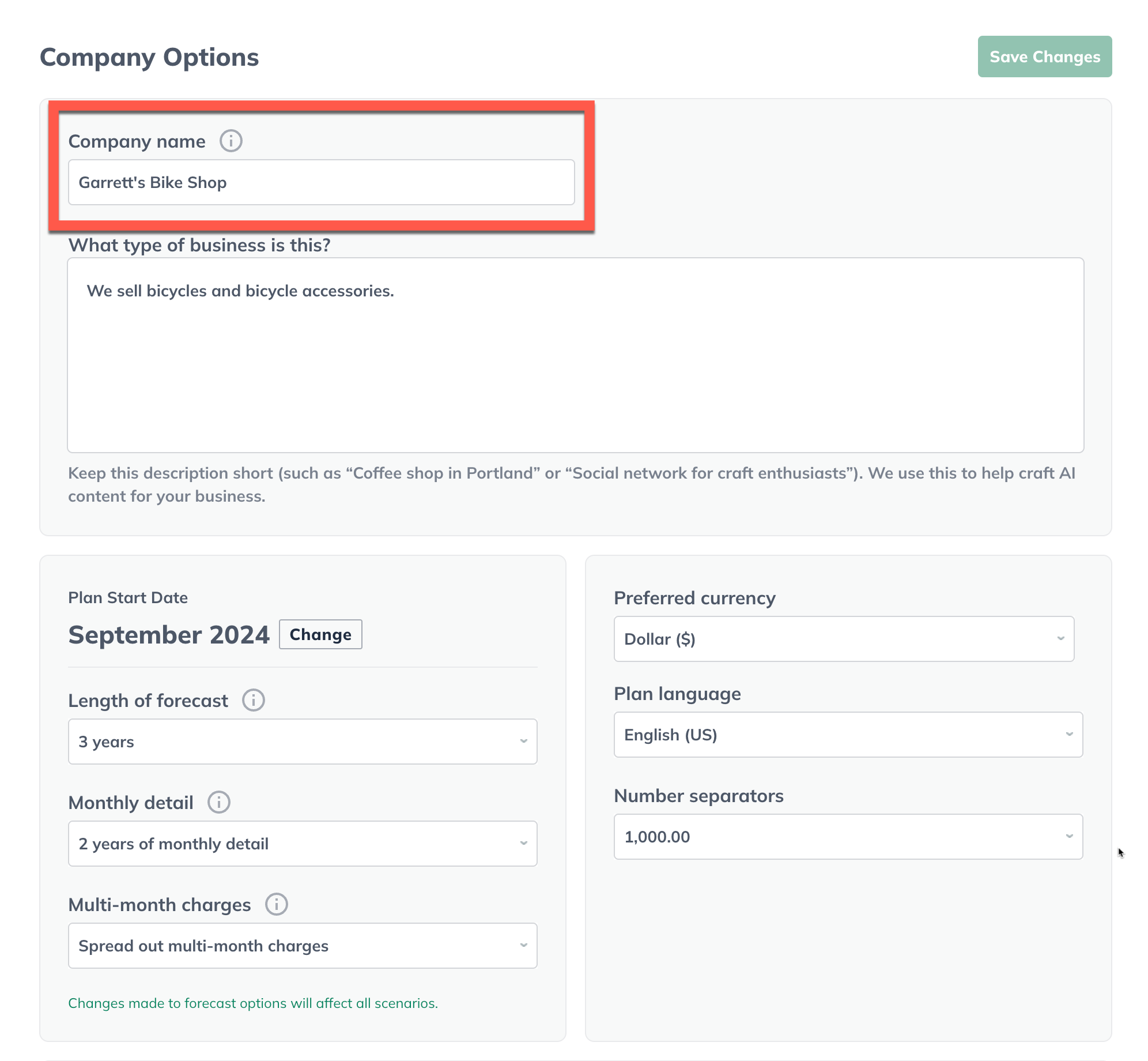 Note: Changing the company name here will change it in the Plan, but not the Pitch or cover page.