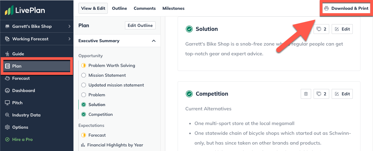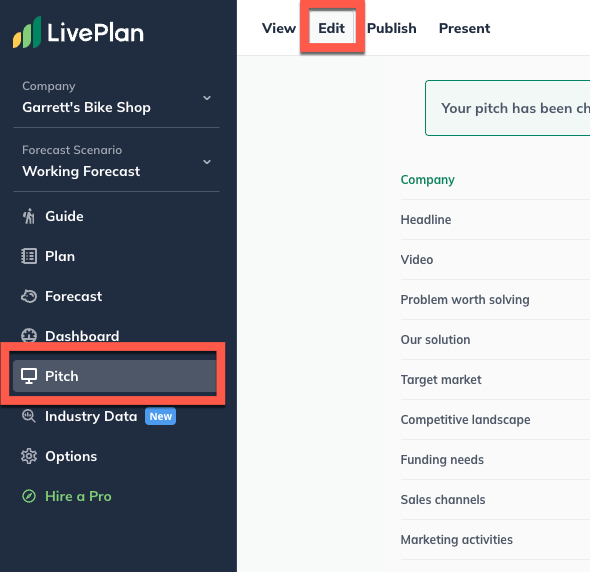 Note: Depending on the sections of LivePlan you're using, you may not need to make all three of these changes. If you want to change the name in the Pitch, the Plan, and the optional Plan cover page, then you will want to make all three.